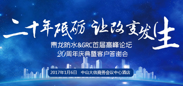 2017年1月6日,由青龍建材主辦的2017年防水&GRC高峰論壇、青龍建材20周年慶典暨客戶答謝會(huì)將于廣東中山市大信商務(wù)會(huì)議中心酒店盛大舉行,期間將邀請(qǐng)國內(nèi)外著名專家學(xué)者蒞臨參會(huì),旨在齊聚防水和GRC行業(yè)各界人事,共同探討當(dāng)前形勢(shì)下行業(yè)發(fā)展前景和中國建筑業(yè)的趨勢(shì),破解行業(yè)難題。青龍建材作為東道主和主辦方,將就公司未來發(fā)展戰(zhàn)略作出重要闡述。此次行業(yè)大咖再次齊聚一堂將會(huì)碰撞出怎樣的火花,我國防水和GRC的未來究竟該如何?青龍建材誠邀行業(yè)同仁蒞臨參與拭目以待。