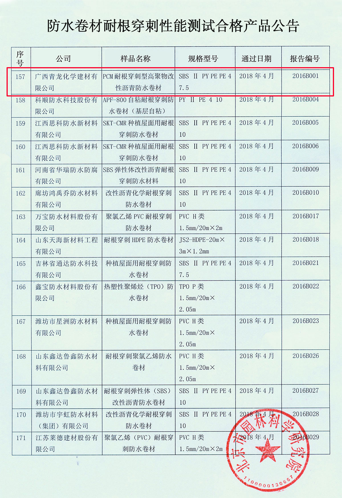 2018年5月4日,北京園林科學(xué)研究院官方網(wǎng)站發(fā)布了《防水卷材耐根穿刺性能測(cè)試合格產(chǎn)品最新公告》,廣西青龍化學(xué)建材有限公司等17家防水企業(yè)生產(chǎn)的23款防水卷材通過(guò)耐根穿刺性能專(zhuān)項(xiàng)測(cè)試。青龍耐根穿刺型防水卷材測(cè)試的順利通過(guò),將可以為種植屋面客戶提供全面的安全、防水保障。