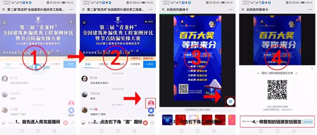 2、邀約朋友進直播間觀看有獎:凡邀約朋友進入青龍直播間觀看,直播榜單上的邀約人數(shù),即成為你的邀約榜單人數(shù),每邀約1人即可獲得1元獎勵。最終獎勵僅限前10名。同時為保證活動的公正性,凡后臺發(fā)現(xiàn)數(shù)據(jù)增加異常,系統(tǒng)將自動判定為惡意作弊,將取消其參加活動資格。(邀約方法:青龍直播間→右下角"邀"圖標(biāo)→右下角二維碼圖標(biāo)→將復(fù)制的鏈接發(fā)給微信朋友。朋友點擊后,即成為你的邀約下線。)