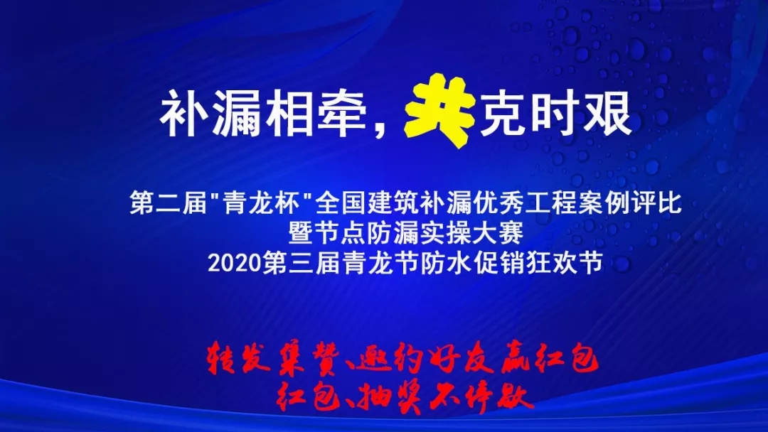 2月24日,第二屆"青龍杯"全國建筑補漏優(yōu)秀工程案例評比暨節(jié)點防漏實操大賽、2020第三屆青龍節(jié)防水促銷狂歡節(jié)將正式網(wǎng)上直播。