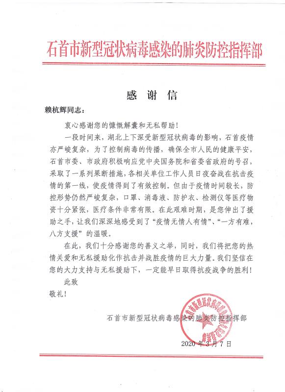 感謝信來(lái)自石首市新型冠狀病毒感染的肺炎防控指揮部,信中表示,對(duì)青龍公司及旗下代理商善義之舉表示了高度肯定和感謝,將把大家的"熱情關(guān)愛(ài)和無(wú)私援助化作抗擊并戰(zhàn)勝疫情的巨大力量,早日取得抗疫戰(zhàn)爭(zhēng)的勝利!"