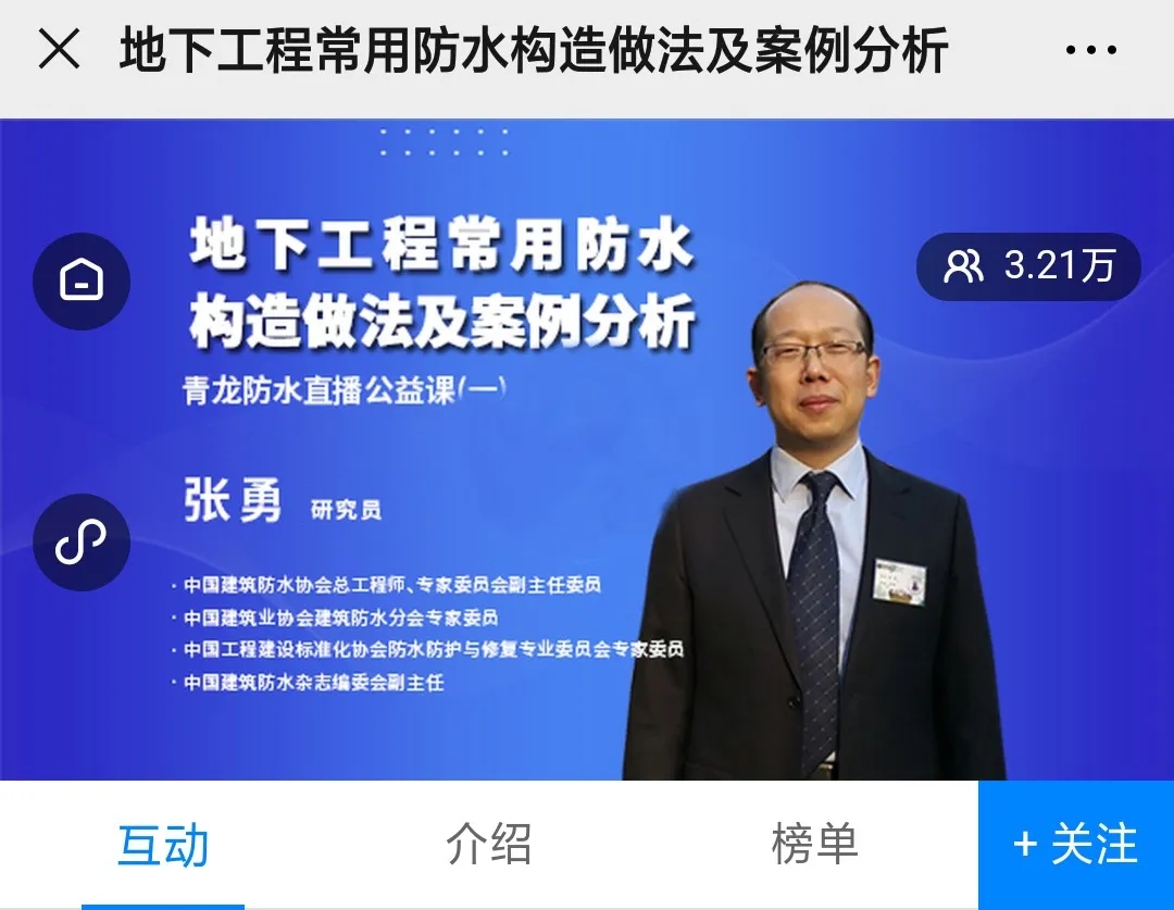 目前,防水公益大講堂已經(jīng)直播了三位防水行業(yè)重量級的大咖:中國建筑防水協(xié)會副會長瞿培華、防水博士張勇、中國建筑防水協(xié)會專家委員會副主任委員朱志遠。直播粉絲平均3萬,場場精彩,讓人大受啟發(fā),轟動了整個防水行業(yè)。