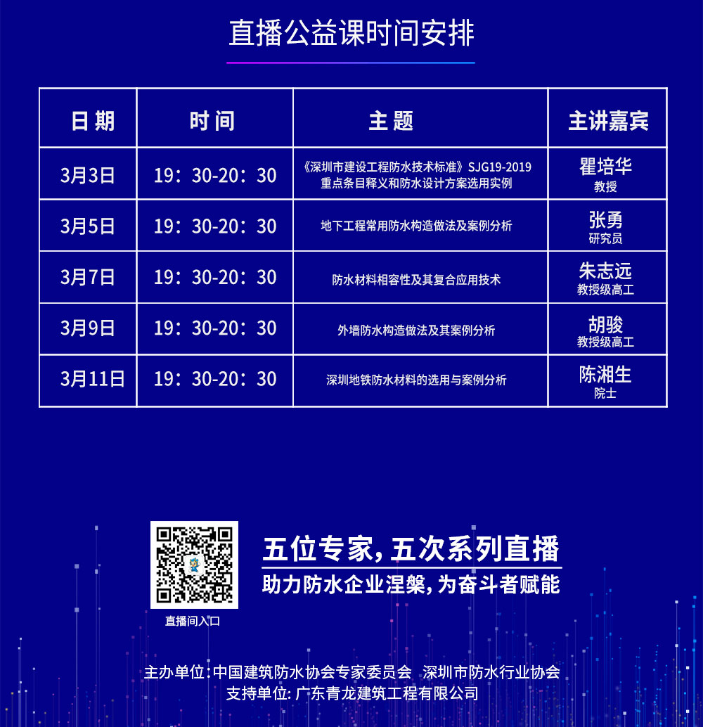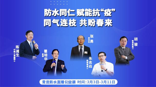 本次防水公益直播是為貫徹落實黨中央關(guān)于新冠肺炎疫情防控工作的決策部署,積極響應各級政府的號召,由中國建筑防水協(xié)會專家委員會、深圳市防水行業(yè)協(xié)會主辦,廣東青龍建筑工程有限公司協(xié)辦,直播由陳湘生院士領銜,瞿培華教授、張勇博士、朱志遠教授和胡駿教授4位專家支招,助力防水企業(yè)涅槃,為奮斗者賦能,讓我們防水人同氣連枝,共盼春來。
