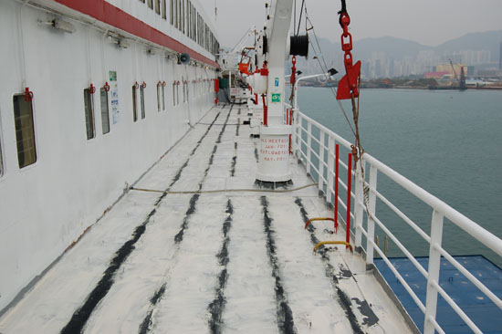 接到該訂單后,3月21日,公司派一支素質(zhì)過硬的施工隊伍奔赴香港開始作業(yè),由于期間香港天氣變化反復(fù),時常下雨;待基面底漆頑固,銹跡斑斑難以清理,均為凹凸不平的麻面;再加上該郵輪白天需正常營業(yè),施工多只能在晚上進行,等等一系列因素都給施工帶來了嚴峻考驗。青龍公司歷來重視每一筆訂,注重每一個細節(jié),董事長宋敦清先生得知后,親自前往,與公司總工徐新生論證了一個較好方案后開始指導(dǎo)施工,考慮到施工部位特殊,長期在海面上風(fēng)吹日曬,之后選用了其耐候、耐酸堿、耐紫外線、耐老化、耐霉菌、耐鹽霧、耐臭氧、耐溶劑、耐磨、耐沖擊和耐油性等綜合性能優(yōu)異的
