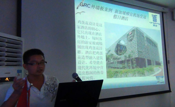 在培訓會上,蘇小麗全面地介紹了公司生產(chǎn)的各類藝術產(chǎn)品,并對它們的生產(chǎn)工藝、安裝細節(jié)及應該注意的問題進行了詳細的解說。龍江則主講《GRC在現(xiàn)在工程中的應用》,從GRC外墻板、裝飾構件以及園林景觀方面的案例出發(fā),向與會的人員展現(xiàn)了GRC在工程中的魅力。不少參加會議的人員都表示受益匪淺,“現(xiàn)在對公司生產(chǎn)的產(chǎn)品有了一個系統(tǒng)的了解,在GRC的安裝工藝方面也增長了不少見識,相信對以后的工作會有很大的幫助?!?/DIV>