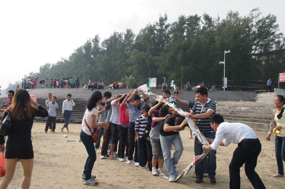 參觀完?yáng)|興互市貿(mào)易區(qū)后職工們前往東興金灘,在沙灘上,公司還組織了一系列生動(dòng)有趣的集體游戲,職工們分為三隊(duì):青龍GRC部門(mén)組成的“青龍GRC,藝術(shù)家園隊(duì)”、青龍公司辦公室成員組成的“保溫防火,青龍?jiān)谙汝?duì)”,以及青龍公司生產(chǎn)中心成員組成的“青龍防水,環(huán)保無(wú)濕隊(duì)”,三隊(duì)玩起了比賽,游戲項(xiàng)目豐富多彩,如撈橘子、無(wú)敵風(fēng)火輪等,大家都玩得不亦樂(lè)乎。