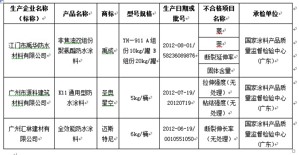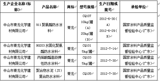 近日,廣東省質(zhì)量技術(shù)監(jiān)督局對廣州深圳、東莞、中山、江門、順德等6個地區(qū)22家企業(yè)生產(chǎn)的防水涂料產(chǎn)品共32批次進行抽查,合格率為90.6%。其中共抽查了青龍公司生產(chǎn)的4批次產(chǎn)品,全部合格。