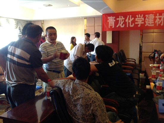 會議結束后,針對大家提出的“怎樣的材料是綠色環(huán)保的”,“怎樣的施工工藝是綠色環(huán)保的”,“綠色施工在PCM反應粘新品上有什么樣的體現(xiàn)”等問題,徐總一一做出詳細的解答,并與大家做了詳細交流。青龍公司向與會人員贈送CQ101水固化聚氨酯防水涂料,并對照GRC樣品進行詳細解說,交流會現(xiàn)場確定了涼山州五縣代理商。