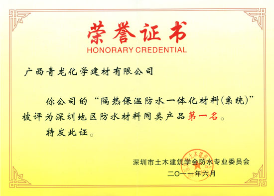 隔熱保溫防水一體化材料(系統(tǒng))"被評為深圳地區(qū)防水材料同類產(chǎn)品一名,