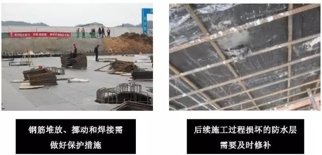 2、防水層施工后,鋼筋砼結(jié)構(gòu)底板施工前的相鄰工序,如支模板、捆扎鋼筋(焊) 等,需要相應班組對防水層的實時、悉心保護;