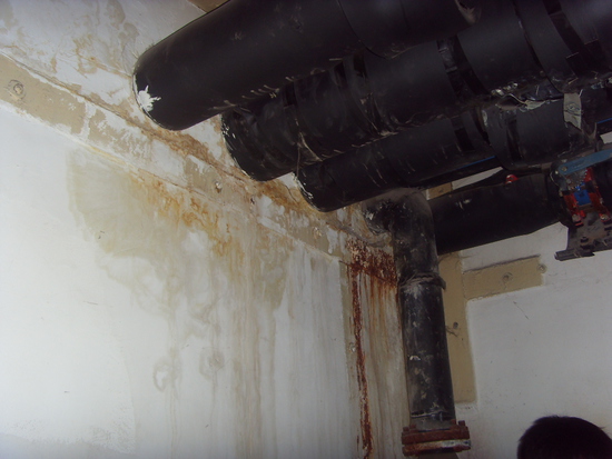 ?。?)穿墻管部位也是外防水薄弱的環(huán)節(jié),如選用卷材處理管根,該部位卷材搭接邊較多,很難做到所有部位搭接滿粘,另外穿墻管周邊混凝土振搗密實(shí)程度不夠,在管根周邊外防水出現(xiàn)問題后,就會(huì)從接縫周邊向內(nèi)滲漏。