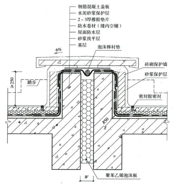 《屋面工程技術(shù)規(guī)范》 GB 50345-2012 4.11.18變形縫的防水構(gòu)造應(yīng)符合下列規(guī)定: 1.變形縫泛水處的防水層應(yīng)增設(shè)附加層,附加層在平面和立面的寬度不應(yīng)小于250mm;防水層應(yīng)鋪貼或刷至泛水墻的頂部。 2.變形縫內(nèi)應(yīng)預(yù)填保溫材料,上部應(yīng)采用防水卷材封蓋,并放置襯墊材料,再在其上干鋪一層卷材。 《屋面工程質(zhì)量驗(yàn)收規(guī)范》 GB 50207-2012 8.6.5 等高變形縫頂部宜加扣混凝土或金屬蓋板?;炷辽w板的接縫應(yīng)用密封材料封嚴(yán);金屬蓋板應(yīng)鋪釘牢固,搭接縫應(yīng)順流水方向,并應(yīng)做好防銹處理。 8.6.6 高低跨變形縫在高跨墻面上的防水卷材封蓋和金屬蓋板,應(yīng)用金屬壓條釘壓固定,并應(yīng)用密封材料封嚴(yán) |
