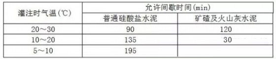 ⑺混凝土澆筑必須連續(xù),因施工需要留設(shè)施工縫,必須征得設(shè)計(jì)同意,并得到監(jiān)理認(rèn)可。允許間歇時間具體見下表;搗固選用的振搗器,其頻率、振幅、振動速度等參數(shù)視混凝土的塌落度及骨料顆徑而定。