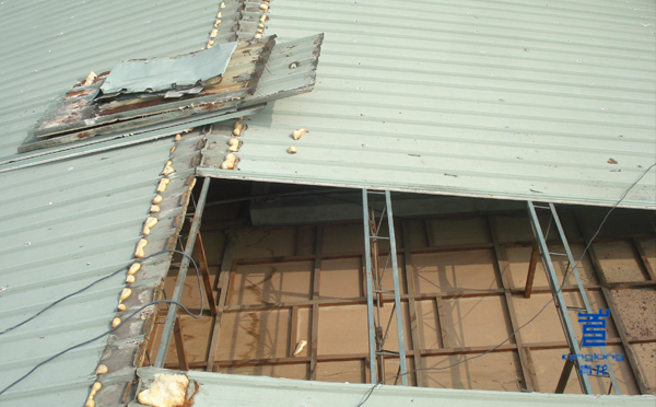 3.加大意外事件發(fā)生的概率。一旦遇上惡烈天氣,彩鋼瓦裂縫很容易被擴(kuò)大,甚至整個(gè)屋面被掀起。