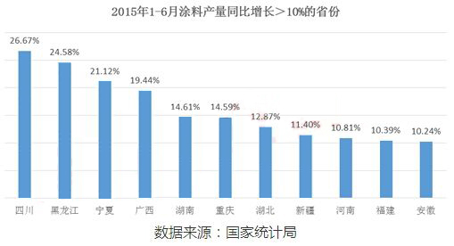 值得注意的是,中西部地區(qū)的防水涂料后勁十足,銷量大增。2015年上半年,四川省表現(xiàn)非常突出,其涂料總產(chǎn)量同比增長高達(dá)26.67%,涂料產(chǎn)量達(dá)到了56.21萬噸,位居第二梯隊(duì)之首,總排名第四。上半年四川省比去年同期增加涂料產(chǎn)量約15萬噸,新增產(chǎn)量相當(dāng)于北京市上半年涂料總產(chǎn)量8.6萬噸的1.74倍。排名第五和第六的分別為湖南49.20萬噸、山東45.63萬噸。下圖是2015年1-6月涂料產(chǎn)量同比增長>10%的省份。